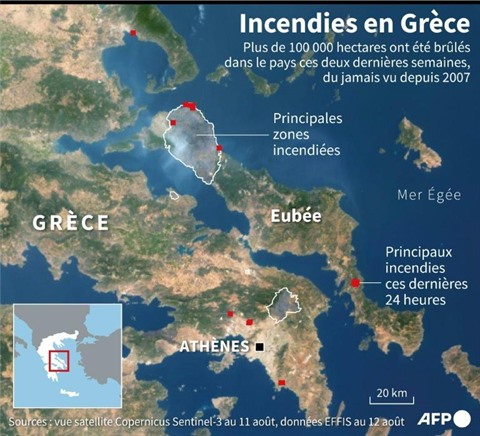 Quelque 586 incendies, selon le vice-ministre de la Protection civile, ont ravagé en quelques jours plusieurs régions du pays, offrant un spectacle de désolation avec des bâtiments calcinés et une nature saccagée. Au total, du 29 juillet au 12 août, ce sont 100.874 hectares de pinèdes, forêts et oliveraies qui sont partis en fumée en Grèce, selon les calculs effectués par l'AFP à partir des données du Système européen d'information sur les feux de forêts (EFFIS). Plusieurs feux étaient toujours en cours jeudi, en particulier sur l'île d'Eubée, durement touchée, et dans trois régions de la péninsule du Péloponnèse.