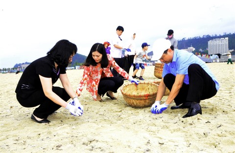 | Les bénévoles collectent des déchets sur la plage de la baie de Ha Long. |