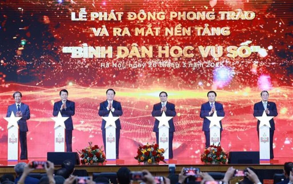 | Le Premier ministre Pham Minh Chinh (4e, gauche) et les délégués lors de la cérémonie de lancement du mouvement "Alphabétisation numérique", le 26 mars. |