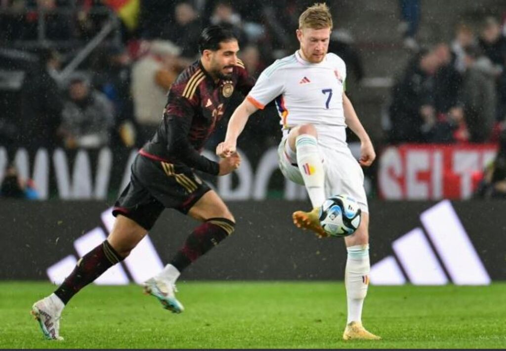 | Kevin De Bruyne (N.7) à la lutte avec Emre Can a été le grand artisan de la victoire de la Belgique en Allemagne, le 28 mars à Cologne. |