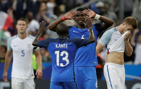 | Les milieux de terrain français Paul Pogba et Ngolo Kanté après le succès en amical contre l'Angleterre, le 13 juin au Stade de France. |