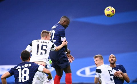 | Tête de l’attaquant français Marcus Thuram (centre) lors du match amical contre la Finlande au Stade de France, le 11 novembre. |