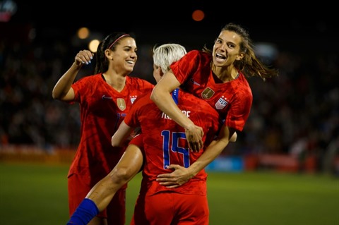 | Les Américaines victorieuses face aux Australiennes (5-3) en match de préparation à la Coupe du monde 2019, à Commerce City dans le Colorado, le 4 avril. |