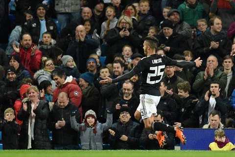 | Le milieu de terrain argentin Manuel Lanzini célèbre, avec le public, un but marqué contre l'Italie lors d'un match amical, à Manchester, le 23 mars. |