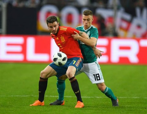 | Le défenseur allemand Joshua Kimmich (droite) et le milieu de terrain espagnol se disputent le ballon à Düsseldorf, le 23 mars. |