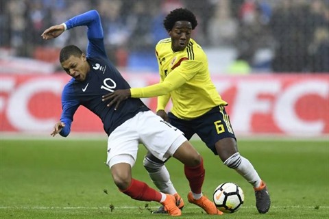 | L'attaquant français Kylian Mbappé (gauche) dispute le ballon avec le milieu de terrain colombien Carlos Sanchez au Stade de France, le 23 mars. |