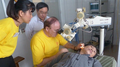 | Le docteur Jean-Claude Beltrando mène une otoscopie sous microscope à My Tho (province de Tiên Giang, Sud) en 2014. |