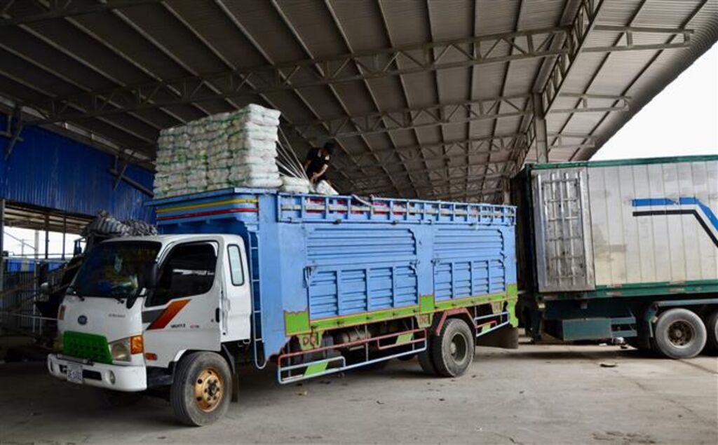 | Des camions transportant des produits agricoles vers le Cambodge via le poste-frontière national de Khanh Binh, dans la province d’An Giang. |
