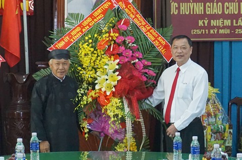 | Le secrétaire adjoint permanent du Comité provincial du Parti d'An Giang, Vo Anh Kiêt (droite), offre un bouquet de fleurs au Conseil d'administration du Comité central de l'Église bouddhique Hoà Hao. |