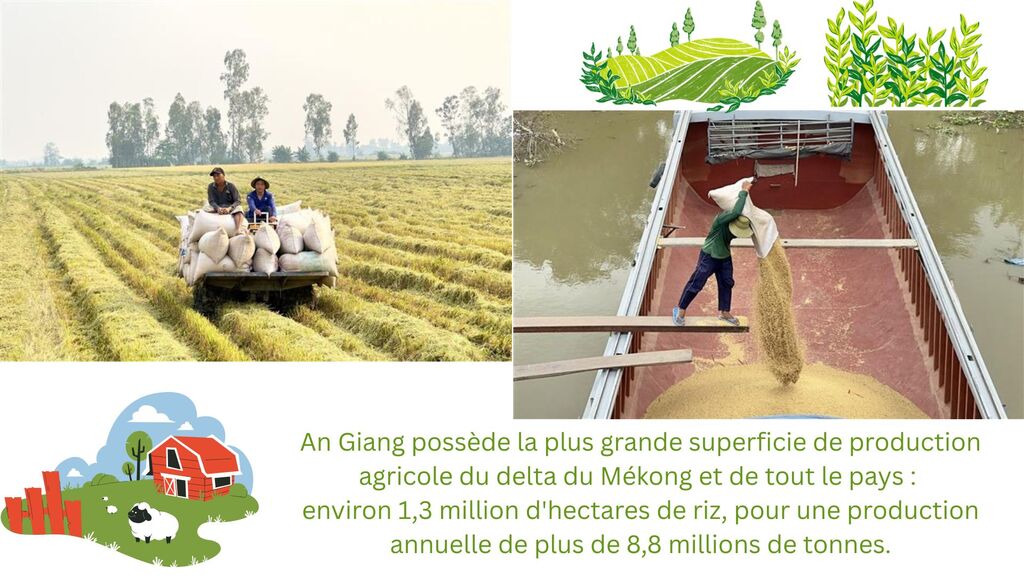 Le vice-président du Comité populaire provincial, Ngô Công Thuc, a déclaré qu'après la fusion des deux provinces (Kiên Giang et An Giang), cette localité possède la plus grande superficie de production agricole du Delta du Mékong et de tout le pays : environ 1,3 million d'hectares de riz pour une production annuelle de plus de 8,8 millions de tonnes.