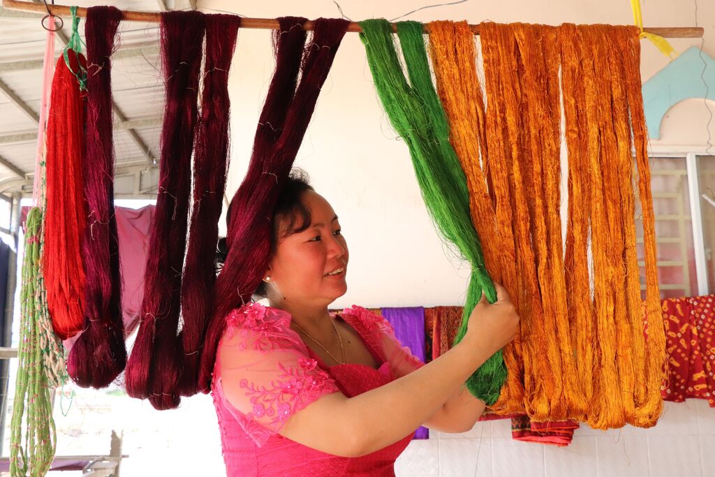 | Chanh Da Ty, patronne d’un atelier de tissage dans la commune de Van Giao, vérifie la soie après sa teinture. |