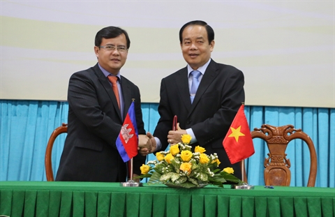 | Le président du Comité populaire de la province d’An Giang, Vuong Binh Thanh (droite), et le chef de la province cambodgienne de Takeo, Lay Vannak. |