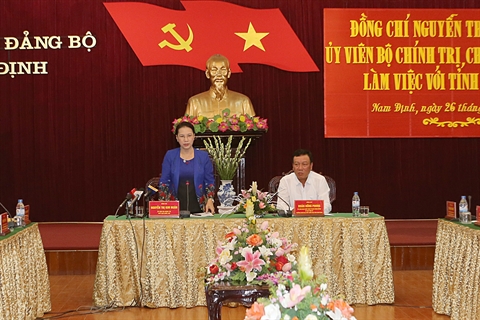 | La présidente de l’Assemblée nationale Nguyên Thi Kim Ngân lors de la séance de travail avec les autorités de Nam Dinh (Nord), le 26 août. |