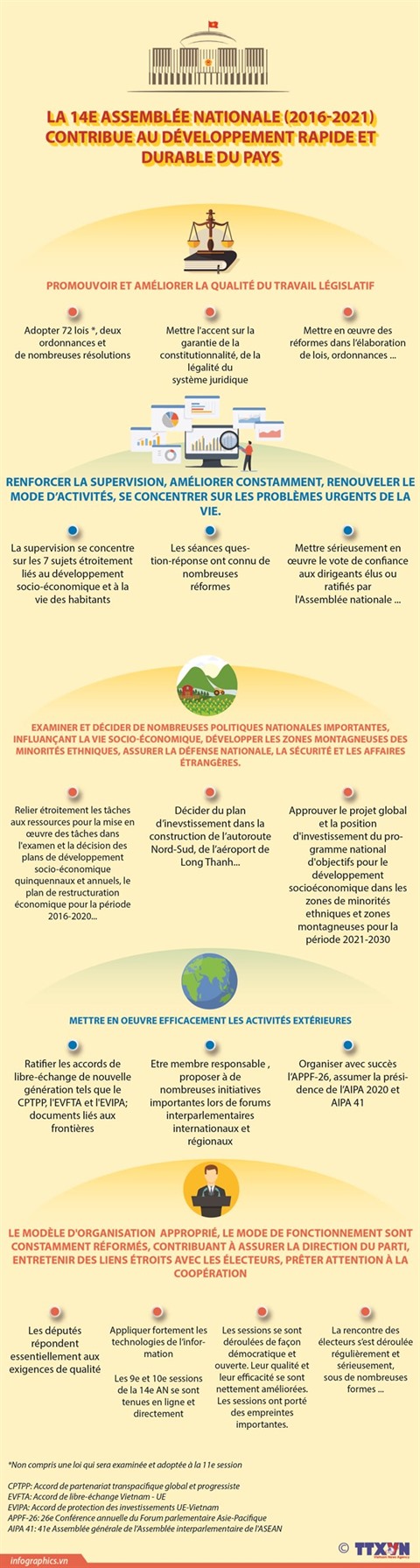 Les fonctions et devoirs de l'AN sont définis de manière exhaustive dans les domaines constitutionnelle et législative, de supervision suprême et de prise de décision sur les questions importantes du pays, afin de servir les intérêts du peuple.