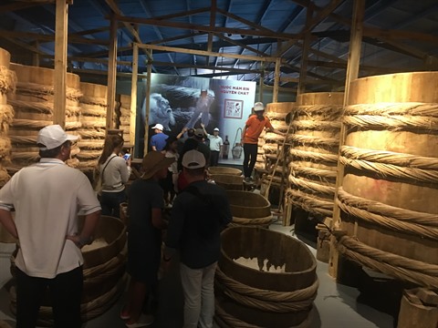 | Les touristes admirent les grosses barriques en bois pour la fermentation du nuoc mam. |