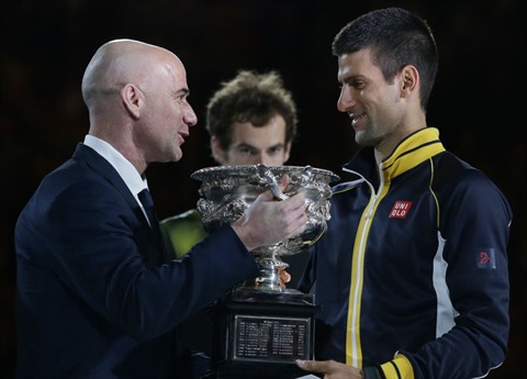 | Novak Djokovic tient le trophée de l’Open d’Australie 2013, remis par Andre Agassi (gauche). |