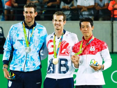 | L’argent pour Del Potro (gauche), l’or pour Murray (centre) et le bronze pour Nishikori, le 14 août à Rio. |