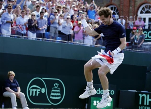 | La joie du Britannique Andy Murray après sa victoire face à Gilles Simon, qui qualifie la Grande-Bretagne pour les demi-finales de la Coupe Davis, le 19 juillet à Londres. |