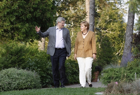 | La chancelière allemande Angela Merkel et le Premier ministre canadien Stephen Harper à Gatineau, le 15 août à |
