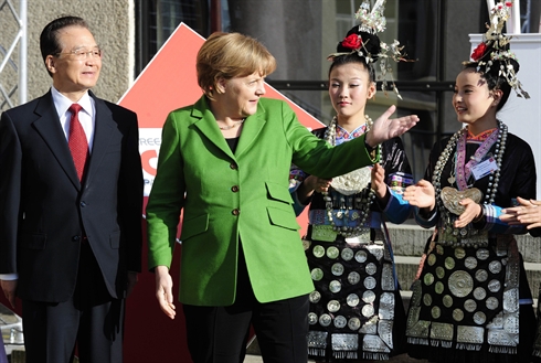 | La chancelière allemande Angela Merkel et le Premier ministre chinois Wen Jiabao, le 22 avril à la Foire industrielle de Hanovre. Photo : AFP/VNA/CVN |