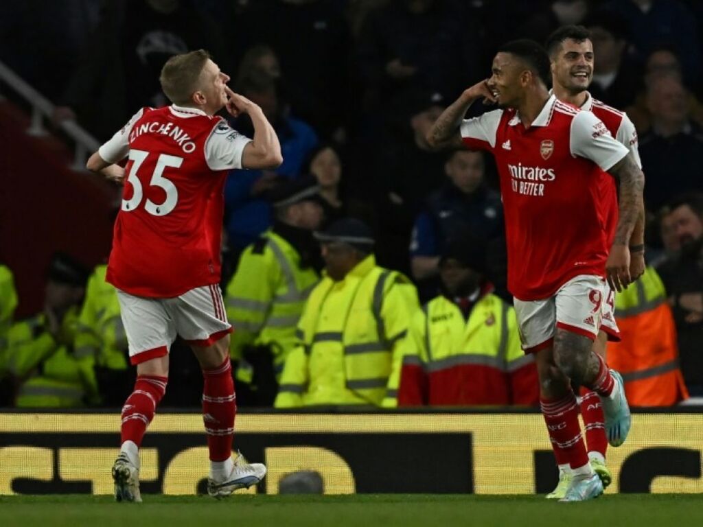 | Les joueurs d'Arsenal à la fête après le 3e but contre Chelsea, marqué par Gabriel Jesus (N°9) à l'Emirates Stadium, le 2 mai. |
