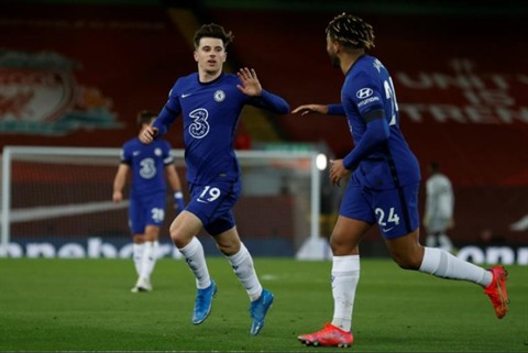 | Mason Mount (N°19) vient d'offrir la victoire à Chelsea contre Liverpool lors du choc de Premier League disputé à Anfield, le 4 mars. |