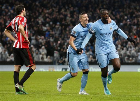 | La joie de Yaya Touré et Stevan Jovetic (centre) après le but du premier pour Manchester City contre Sunderland à l'Etihad Stadium, le 1er janvie |