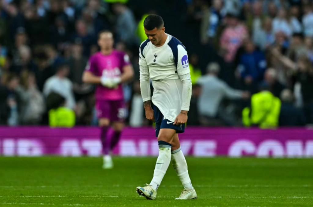 | Pedro Porro, défenseur espagnol de Tottenham Hotspur, dépité au coup de sifflet final. |