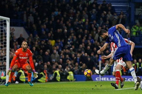 | L'attaquant de Chelsea Diego Costa marque face au gardien de Stoke City à Stamford Bridge à Londres. |