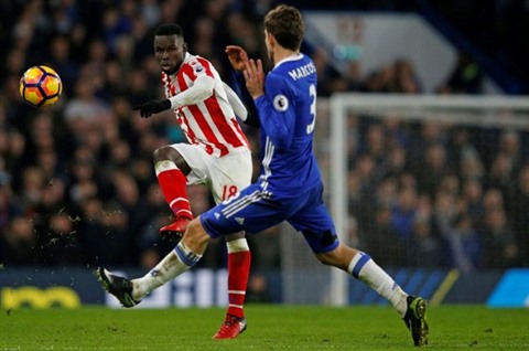 | L'attaquant de Stoke Mame Biram Diouf (gauche) et le défenseur de Chelsea Marcos Alonso lors de la rencontre des deux équipes à Stamford Bridge à Londres. |