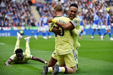 | Le milieu d'Arsenal Emile Smith Rowe célèbre son but avec Pierre-Emerick Aubameyang lors de la victoire d'Arsenal à Leicester, le 30 octobre en Premier League. |