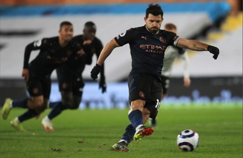 | L'attaquant argentin de Manchester City Sergio Agüero marque sur penalty contre Fulham le 13 mars 2021 à Londres. |