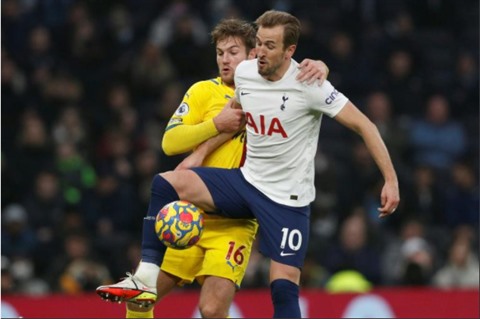 | L'attaquant de Tottenham, Harry Kane (droite), à la lutte avec le défenseur de Crystal Palace Joachim Andersen, le 26 décembre à Londres. |