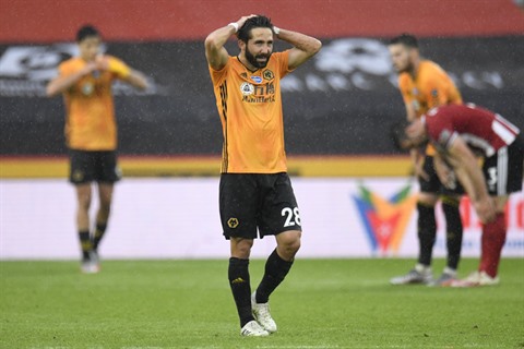 | Les Wolverhampton Wanderers et Joao Moutinho abattus à l'issue de leur défaite sur le terrain de Sheffield United, le 8 juillet. |