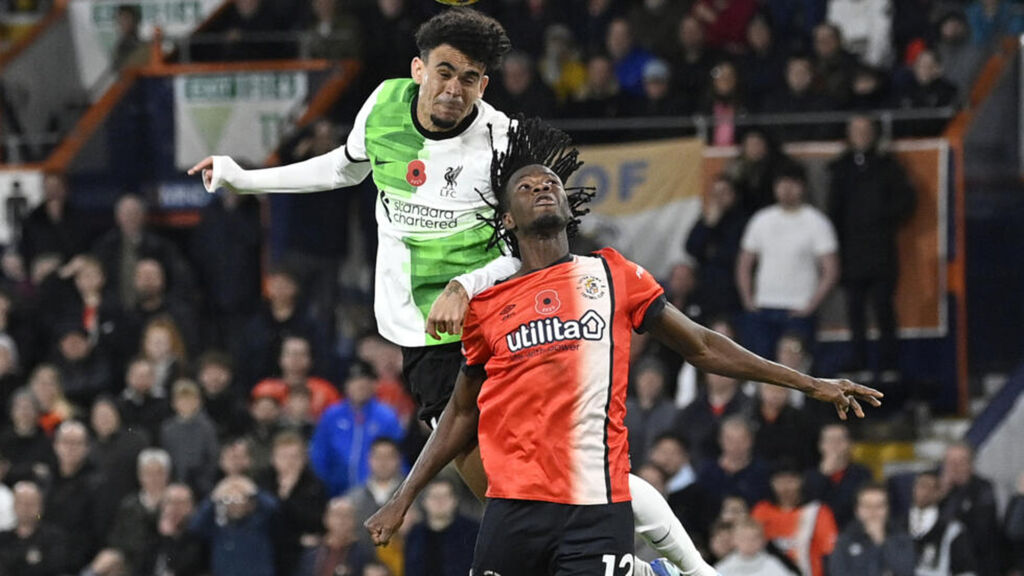 | Le joueur colombien de Liverpoo, luiz Diaz (gauche), marque de la tête sur le terrain de Luton, le 5 novembre. |