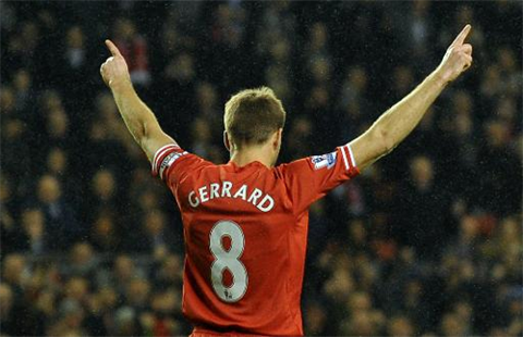 | Le capitaine de Liverpool, Steven Gerrard, célébrant un but marqué sur penalty contre Aston Villa, le 18 janvier 2014 au stade d'Anfield. |