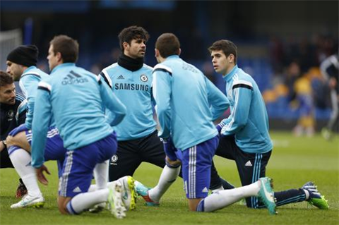 | Les joueurs de Chelsea, dont l'attaquant Diego Costa (centre), à l'échauffement avant un match contre West Ham, le 26 décembre à Stamford Bridge. |