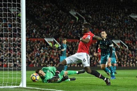 | Le milieu de terrain français de Manchester United Paul Pogba marque un but refusé pour hors jeu contre Southampton, en Premier League, le 30 décembre à Manchester. |