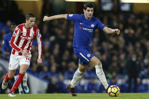 | L'attaquant espagnol de Chelsea Alvaro Morata porte le ballon contre Stoke City en Premier League, le 30 décembre à Londres. |