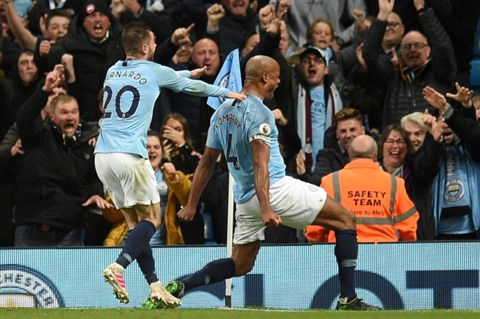 | Le capitaine Vincent Kompany (droite), auteur d'un but spectaculaire pour Manchester City face à Leicester à l'Etihad Stadium, le 6 mai. |