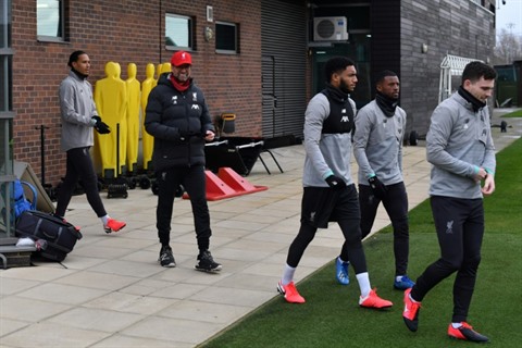| Le manager de Liverpool, Jürgen Klopp, accompagne ses joueurs à une séance d'entraînement au centre de Melwood au nord-ouest de la ville, le 10 mars. |