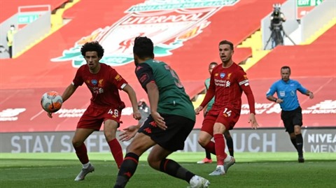 | Le milieu Curtis Jones (gauche) marque le second but pour Liverpool lors du match de Premier League à domicile contre Aston Villa, le 5 juillet. |