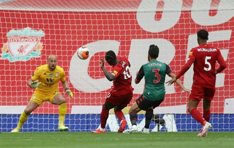 | L'attaquant sénégalais Sadio Sané (2e, gauche) ouvre le score pour Liverpool lors du match de Premier League à domicile face à Aston Villa, le 5 juillet. |