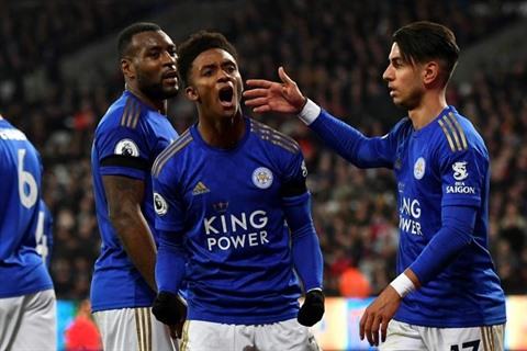 | Demarai Gray (centre) exulte après son but pour Leicester face à West Ham, le 28 décembre au London Stadium. |