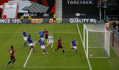 | Malgré sa supériorité numérique, la défense des Bleus du Leicester City concède un but à l'attaquant de Bournemouth Dominic Solanke à Vitality Stadium, le 12 juillet. |