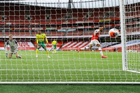 | L'attaquant d'Arsenal, Pierre-Emerick Aubameyang (droite), auteur d'un doublé lors du match de Premier League face à Norwich, à Londrs, le 1er juillet. |