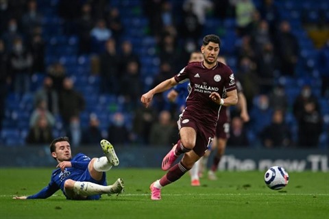 | Le défenseur de Chelsea, Ben Chilwell (gauche), aux prises avec l'attaquant espagnol de Leicester, Ayoze Perez, à Londres, le 18 mai. |