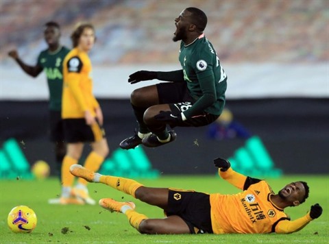 | Le milieu de Tottenham Tanguy Ndombélé taclé par le défenseur de Wolverhamton Nelson Semedo (droite), le 27 décembre à Wolverhamton. |