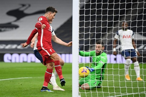 | Le milieu brésilien Roberto Firmino (gauche) marque le 1er but pour Liverpool lors du match de Premier League face à Tottenham, à Londres, le 28 janvier. |