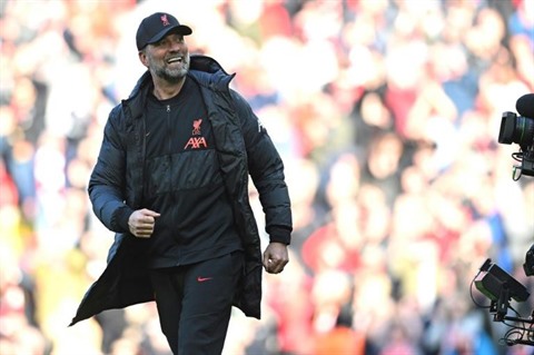| La joie de l'entraîneur allemand de Liverpool, Jurgen Klopp, après la victoire à domicile, 2-0 face à Everton, lors de la 34e journée de Premier League, le 24 avril au Stade d'Anfield Road. |